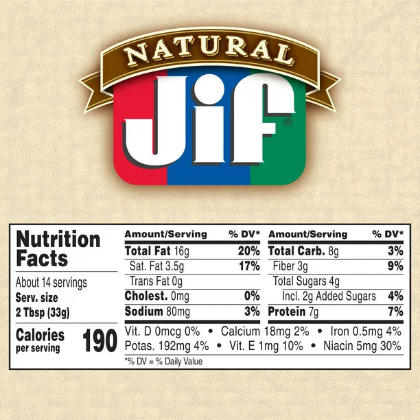 - Containts 1- 16oz Jar of Jif Natural Creamy Peanut Butter Spread